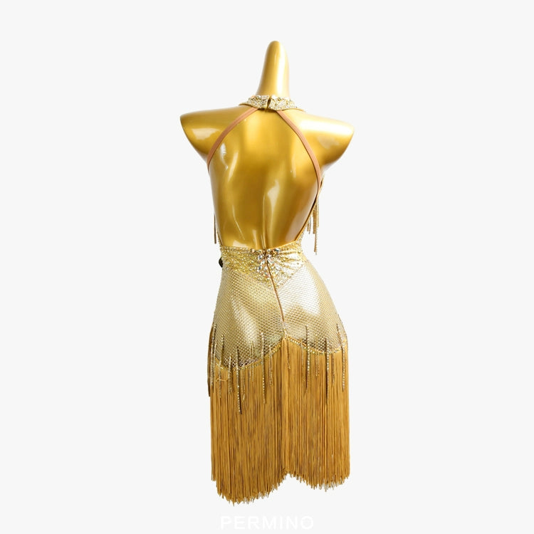PERMINO.L030F Gold Latin Dance Dress – Halter Deep V Rhinestone Mesh Fringe Costume